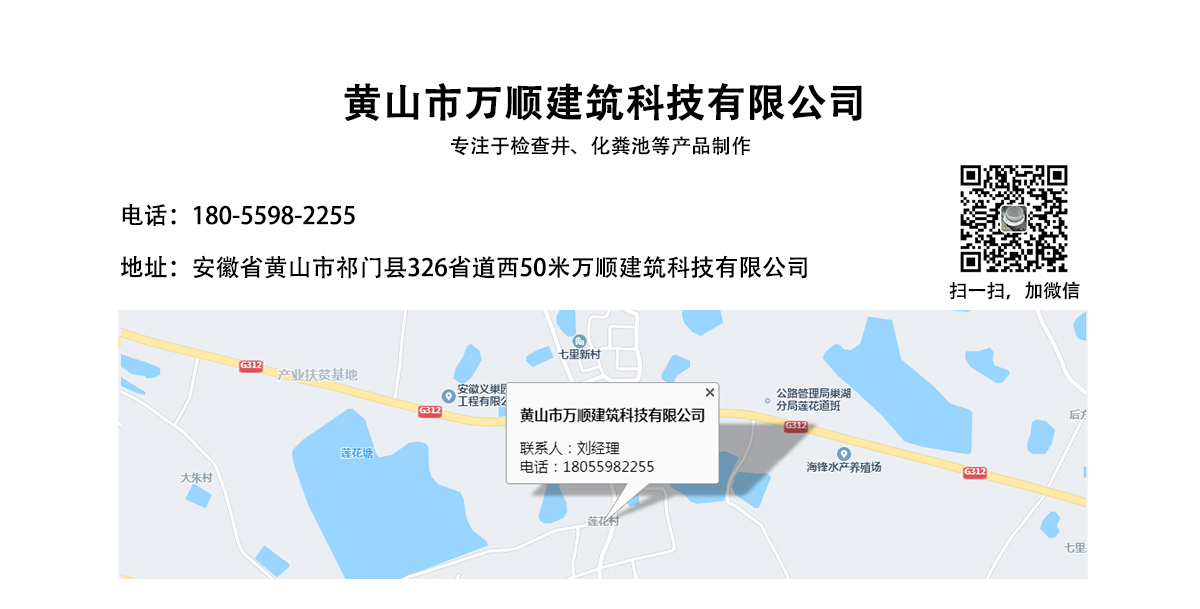 黃山市萬順建筑科技有限公司是集研發,生產制造,市場推廣為一體的綜合性企業。公司主要經營環保型預制鋼筋混凝土裝配式組合型檢查井和蓄水裝置等城建配套產品。產品生產過程采用獨特的生產工藝,機械化流水作業。產品大規模生產,生產效率高,耗能少,成本低,產品使用壽命長、免維護、無滲漏、無污染,符合“綠色環保,低碳節能”的發展要求,是傳統磚砌井池的理想替代產品。